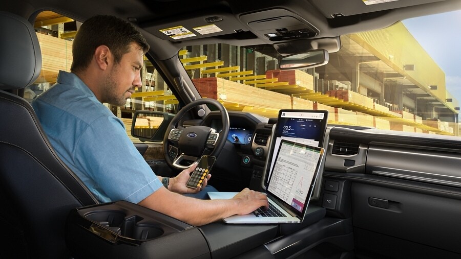 Turn your F-150® Lightning® interior into your on-the-go office. The available work surface folds directly from the center console.